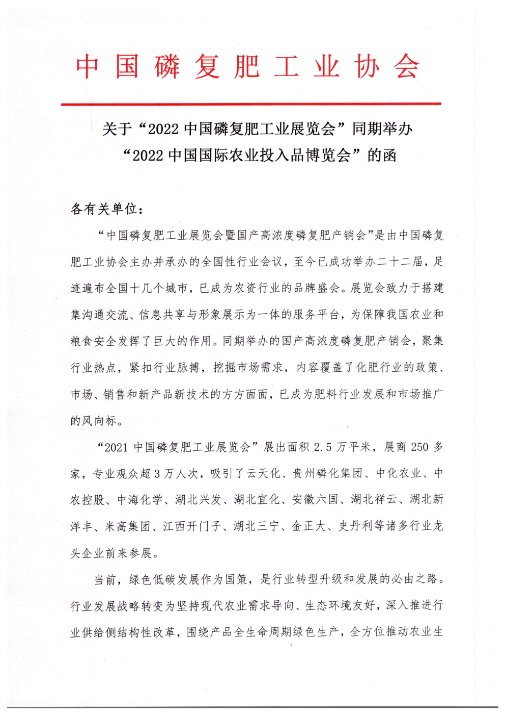 “中国磷复肥工业展览会暨国产高浓度磷复肥产销会”(以下简称“磷复肥产销会”)创办于2000年,每年一届,迄今已成功举办了二十二届,足迹遍布全国十多个省市。2016年,根据行业发展需要,增创了“中国国际特种肥料展览会”;2019年,又增创了“中国国际农业投入品博览会”。